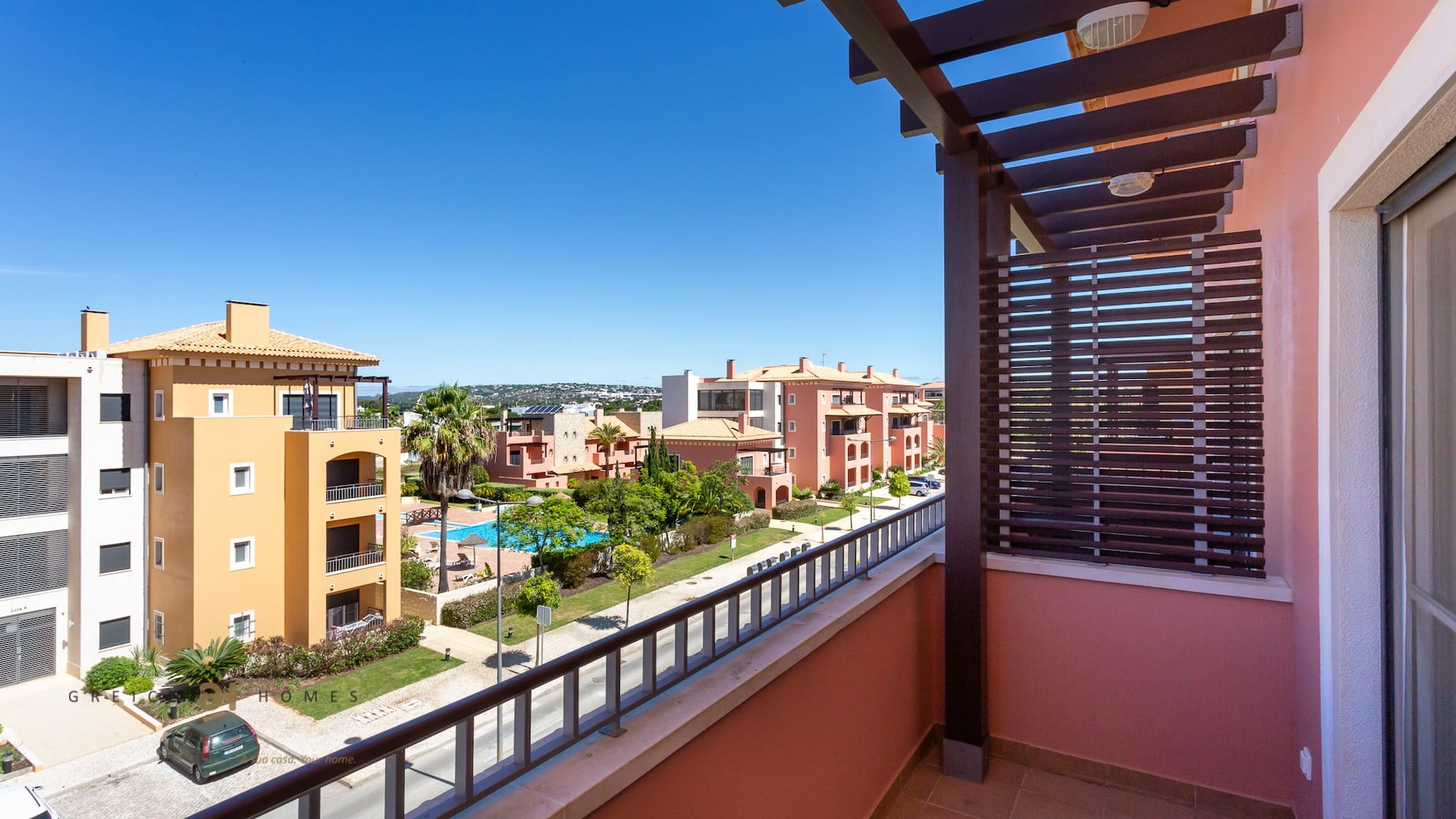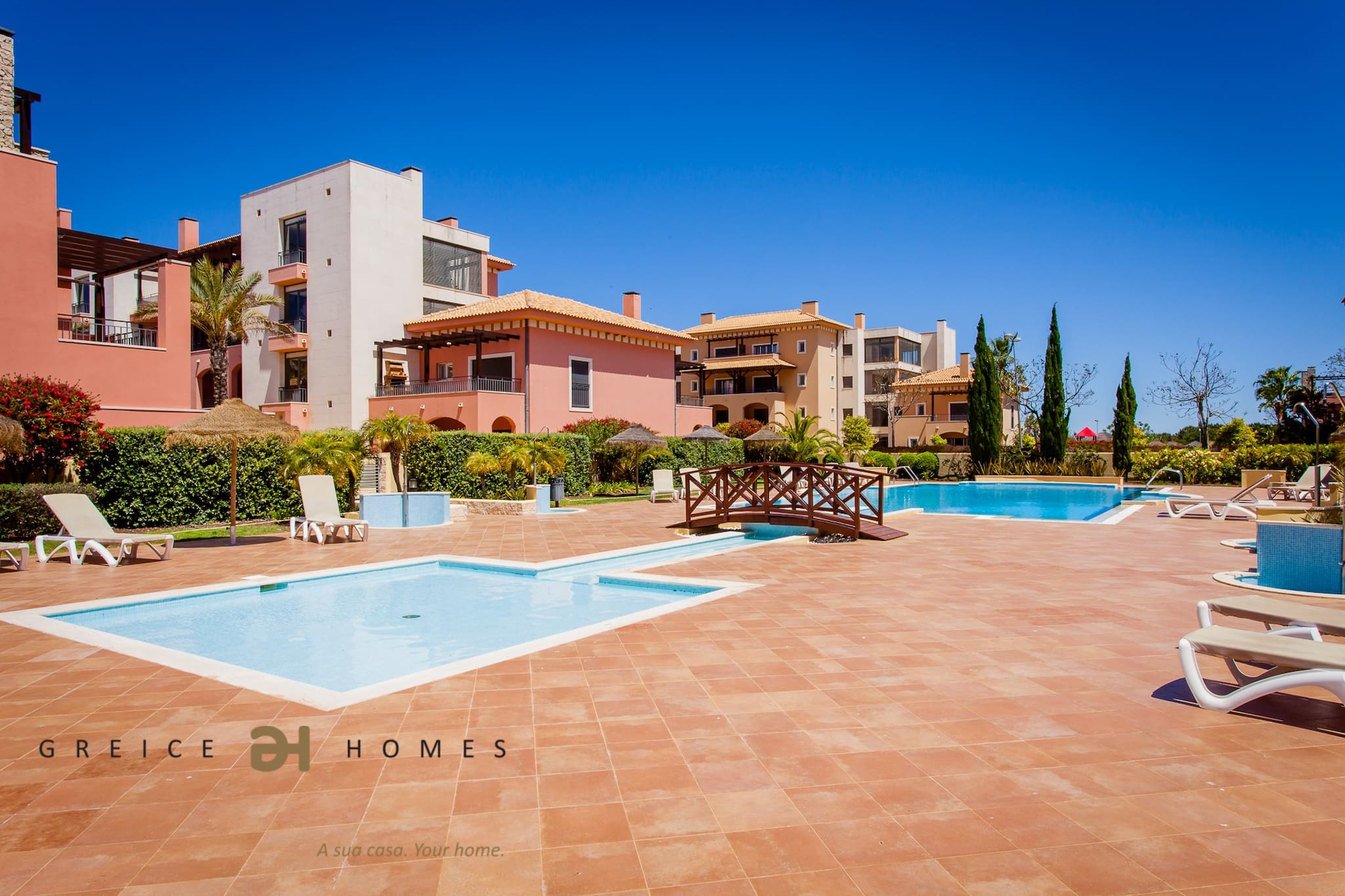 O jardim relvado e a ampla piscina fazem deste empreendimento um local relaxante para as suas férias.