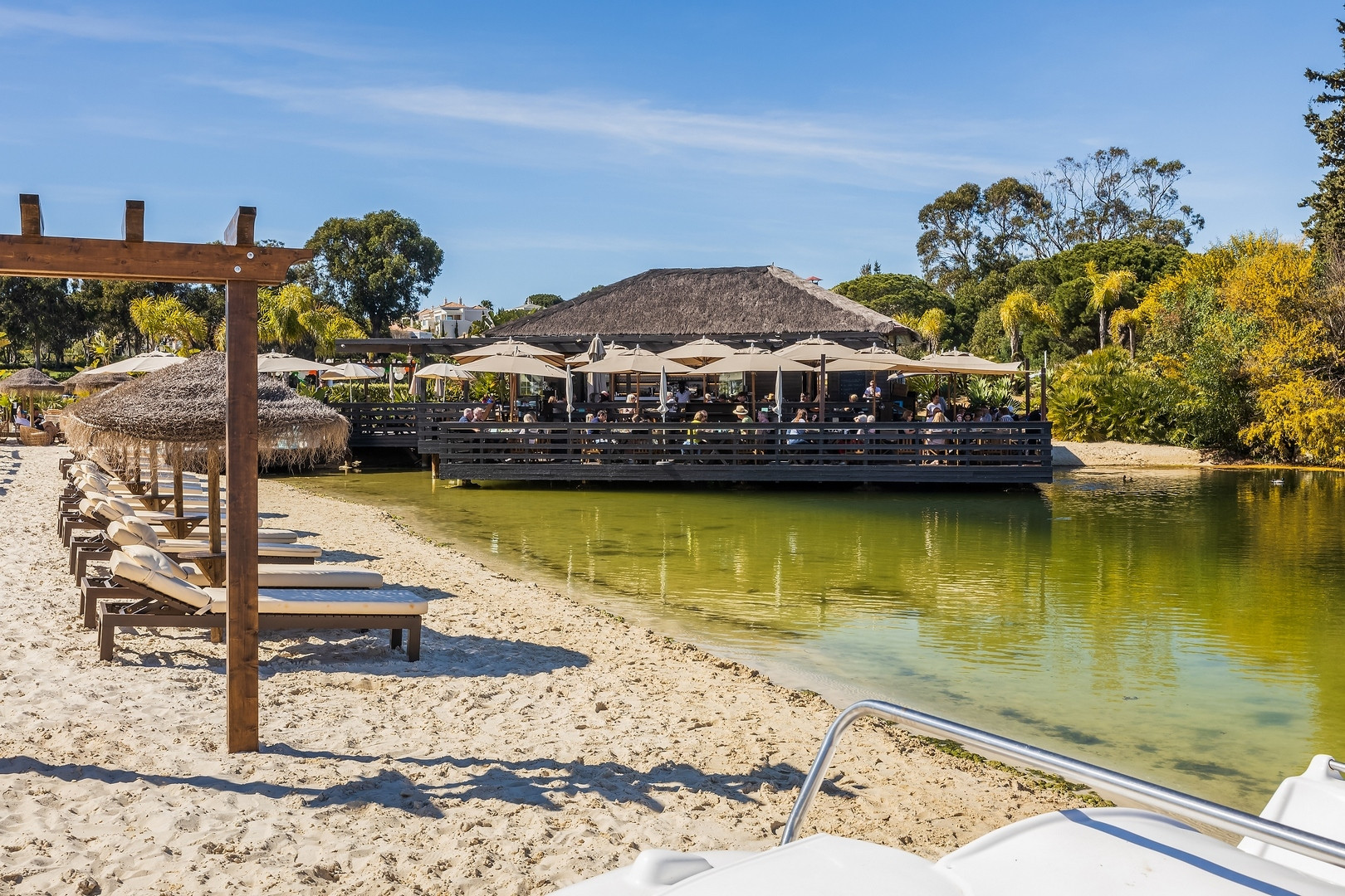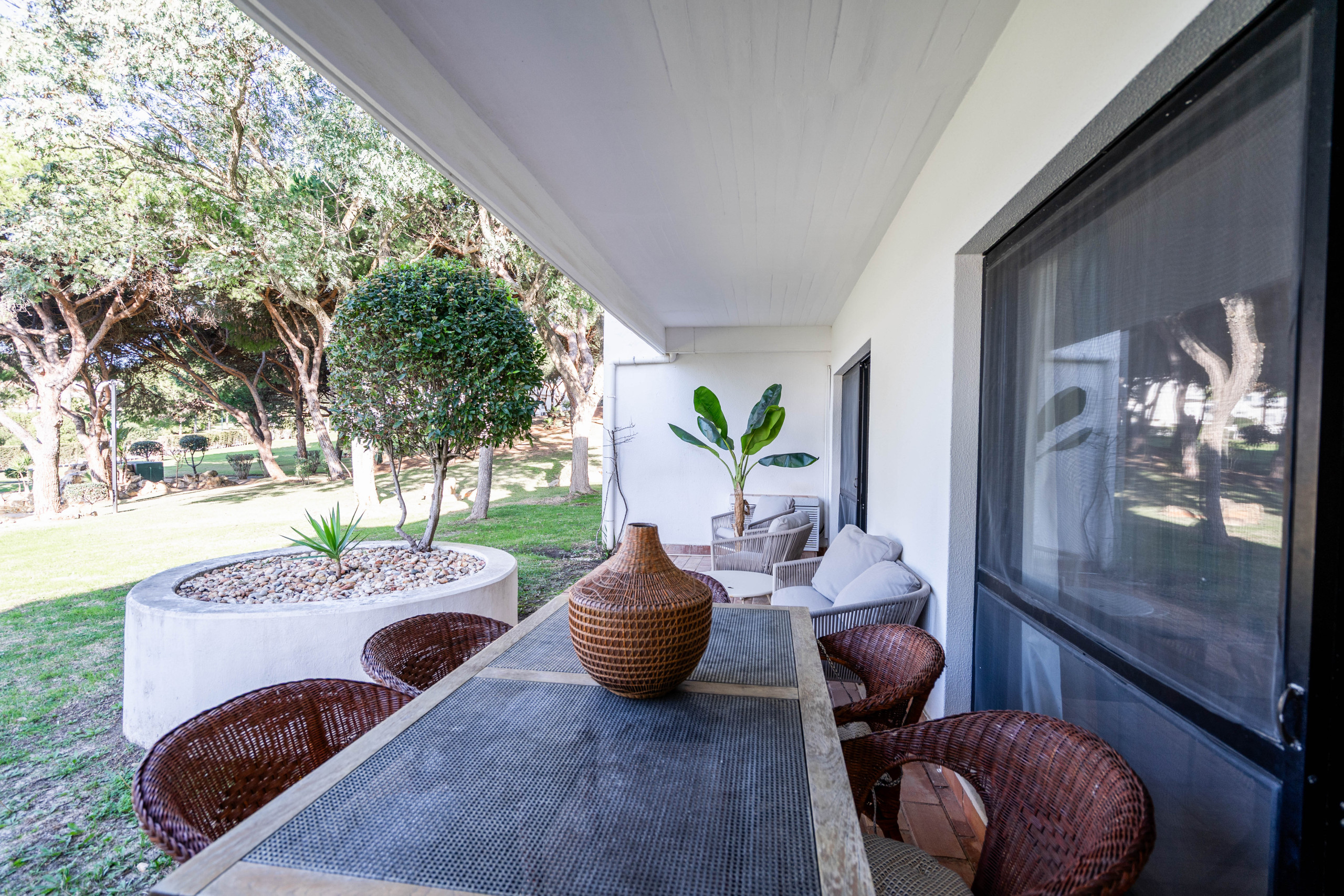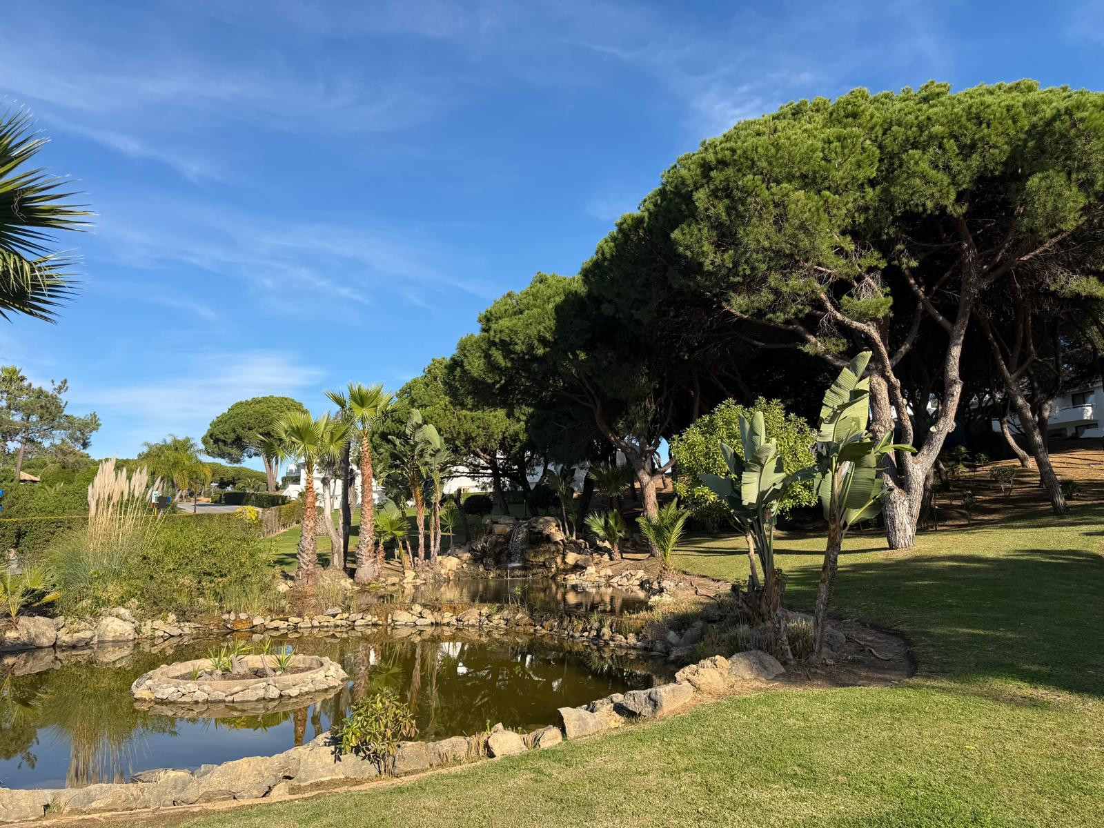 The villa in Almancil has 2 bedrooms and has capacity for 6 people. The villa is cozy, is very light, and is 134 m². It has views of the lake and the garden. The property is located 0 m from the international airport, 100 m from Victory Village pool Café coffee shop, 500 m from The Shake the restaurant, 1 km from Campo de Golfe Quinta do Lago South golf course, 2 km from Praia da Quinta do Lago sand beach, 2 km from Campo de Golfe Quinta do Lago North golf course, 6 km from Pingo Doce – Almancil supermarket, 13 km from AquaShow Park (Quarteira) water park, 17 km from Aeroporto de Faro airport, 18 km from Hospital de Faro (Centro Hospitalar Universitário do Algarve) hospital, 32 km from Zoomarine (Albufeira) water park. The house is situated in a family-friendly neighborhood in a residential complex. The accommodation is equipped with the following items: garden, garden furniture, washing machine, internet (Wi-Fi), hair dryer, balcony, central heating, air-conditioned, communal+children's swimming pool, open-air parking near the building, mosquito net/nets in the bedroom, 1 TV. In the hotplate of glass ceramics open plan kitchen, refrigerator, microwave, oven, freezer, dishwasher, dishes/cutlery, kitchen utensils, coffee machine, toaster and kettle are provided.