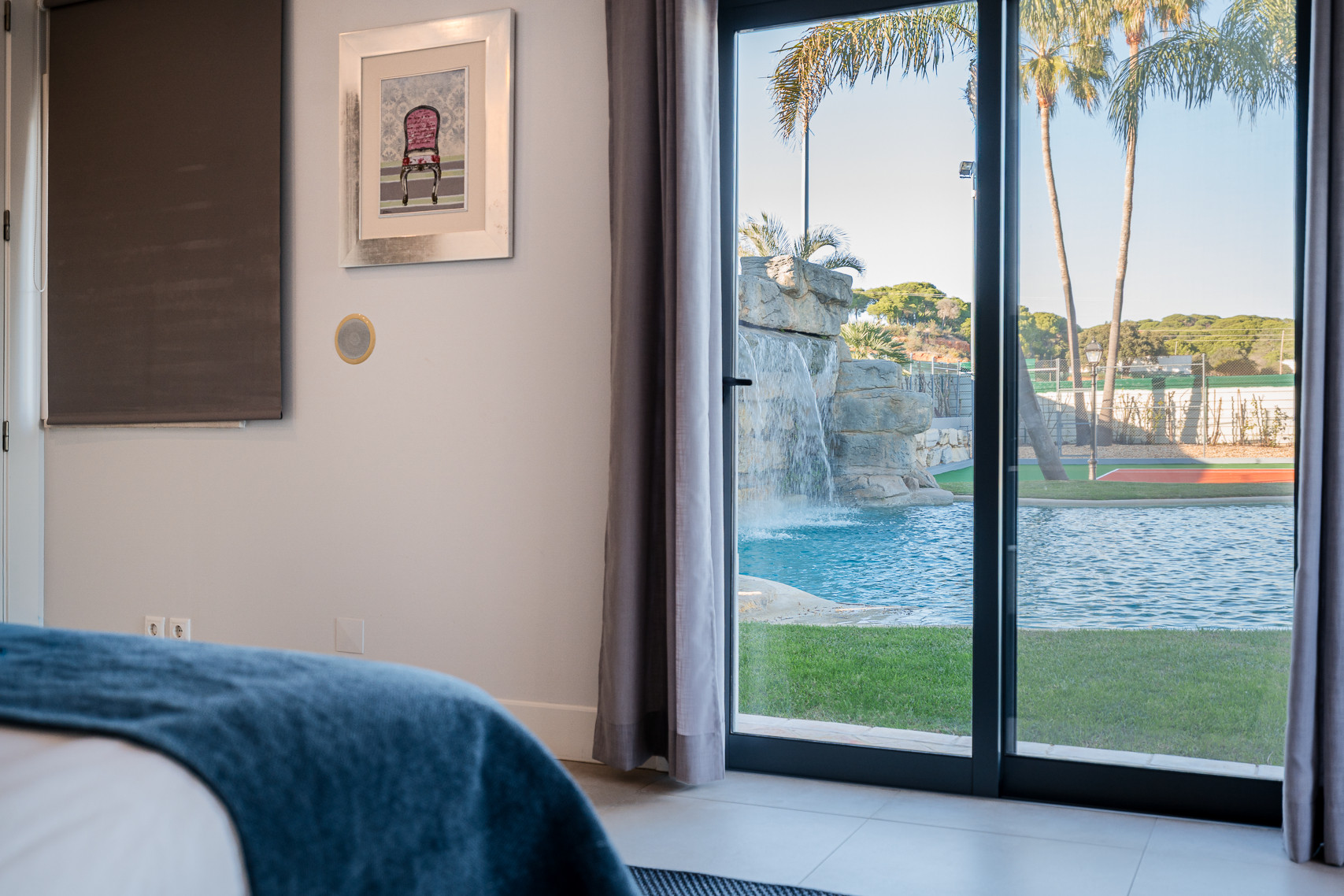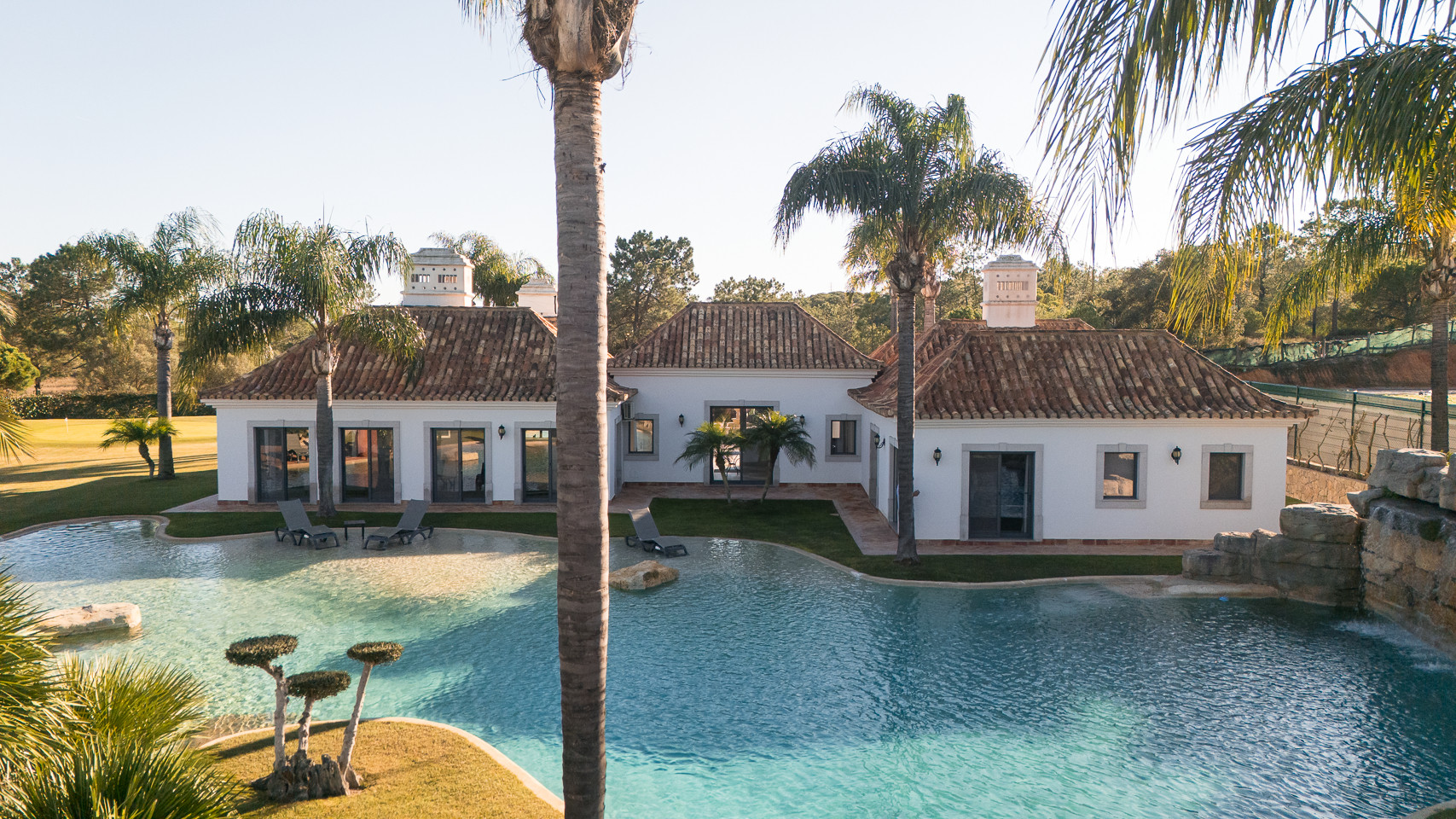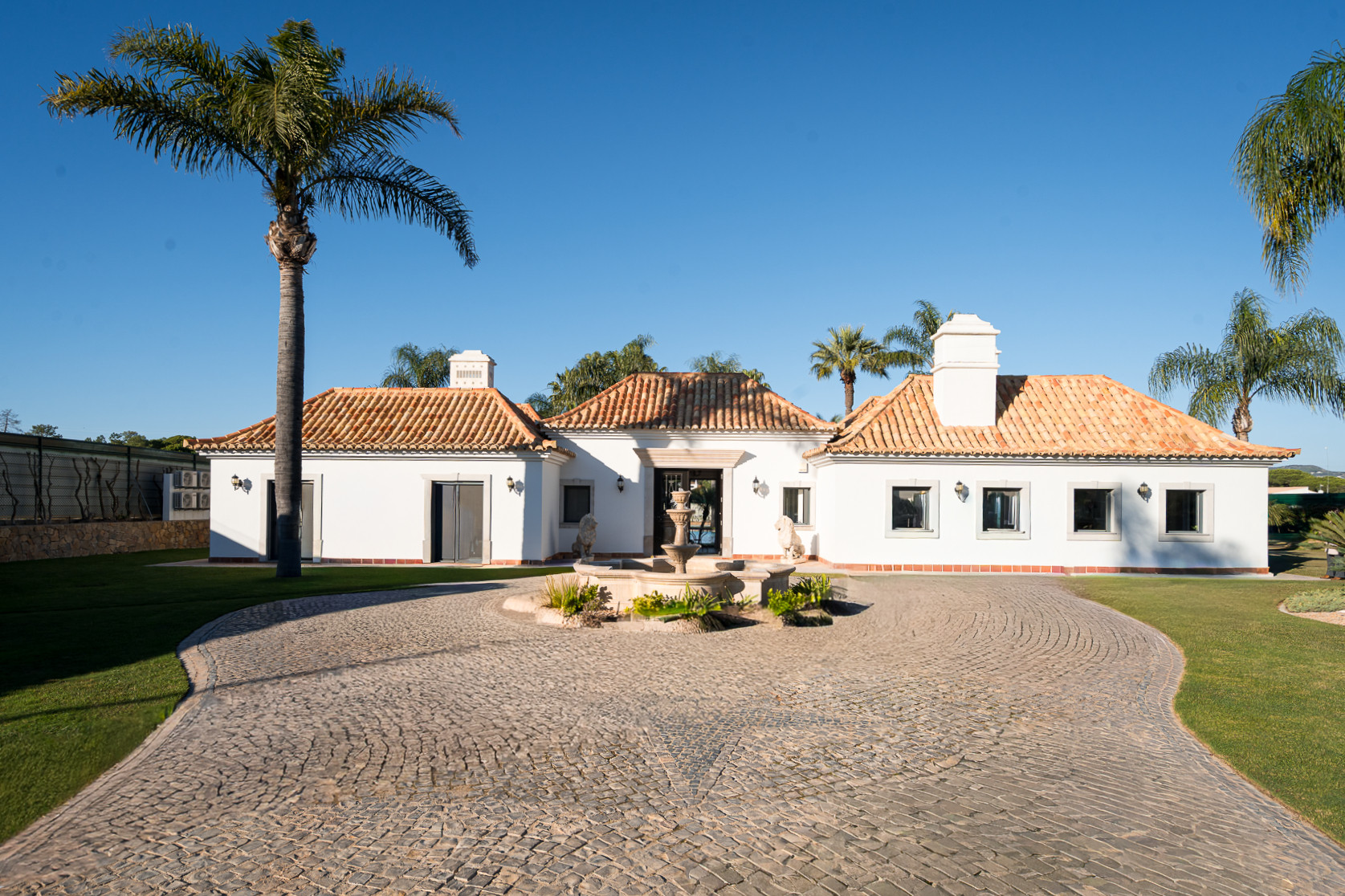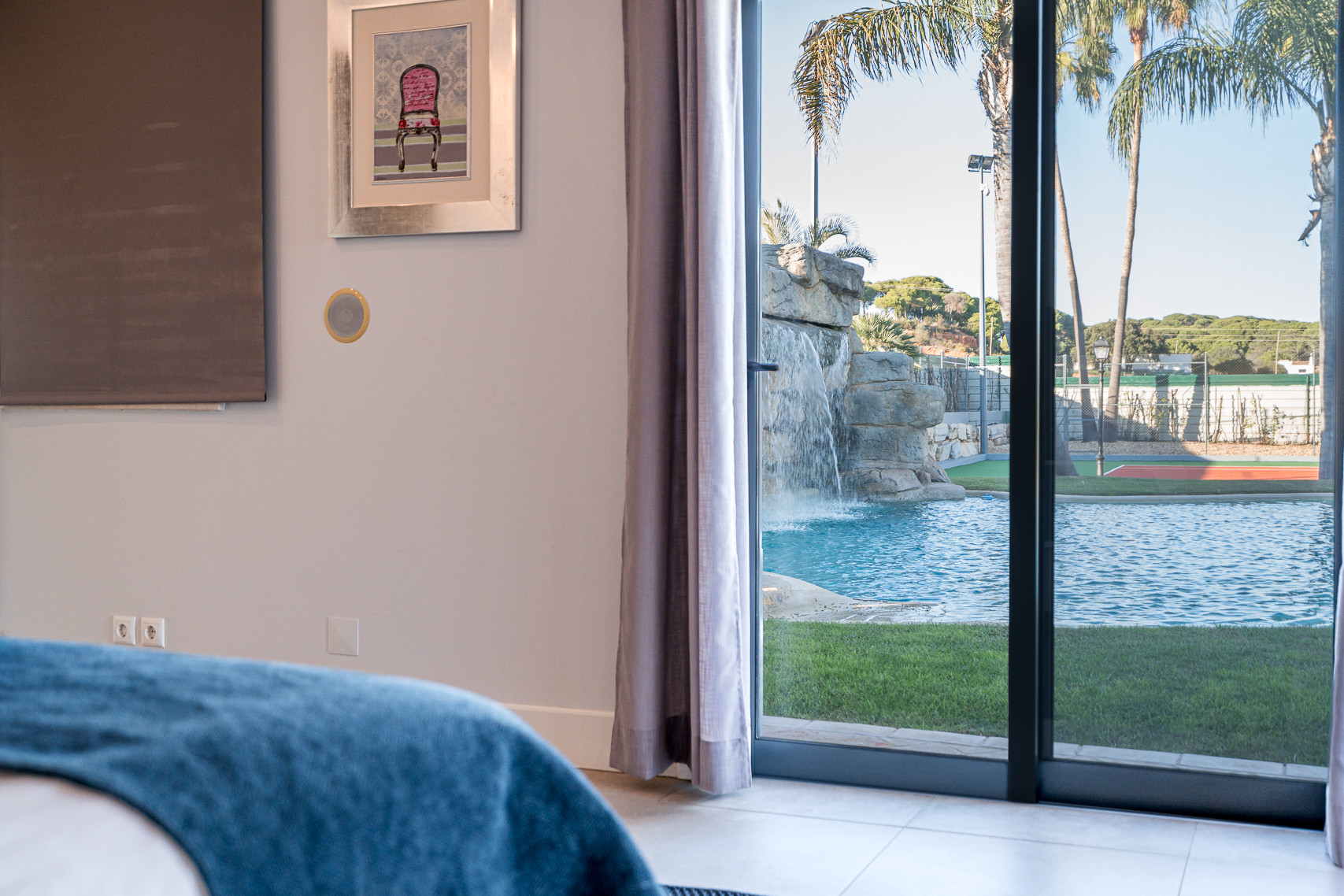 The villa in Quinta do Lago has 4 bedrooms and has capacity for 10 people. The villa is 4,000 m². The accommodation is equipped with the following items: garden, garden furniture, fenced garden, terrace, washing machine, dryer, barbecue, fireplace, iron, internet (Wi-Fi), hair dryer, balcony, tennis court, alarm, central heating, air-conditioned, private swimming pool, private heated swimming pool, open-air parking the same building, TV, satellite tv (Languages: Spanish, English). In the hotplate of glass ceramics open plan kitchen, refrigerator, microwave, oven, freezer, dishwasher, dishes/cutlery, kitchen utensils, coffee machine, frying pan and toaster are provided.