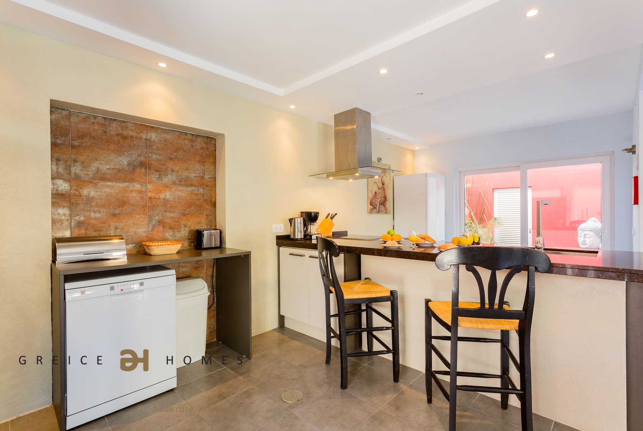 All rooms give access to a beautiful garden, with a dining area, barbecue, sun loungers and swimming pool. Also in the garden we can see an "Oriental" style decoration.