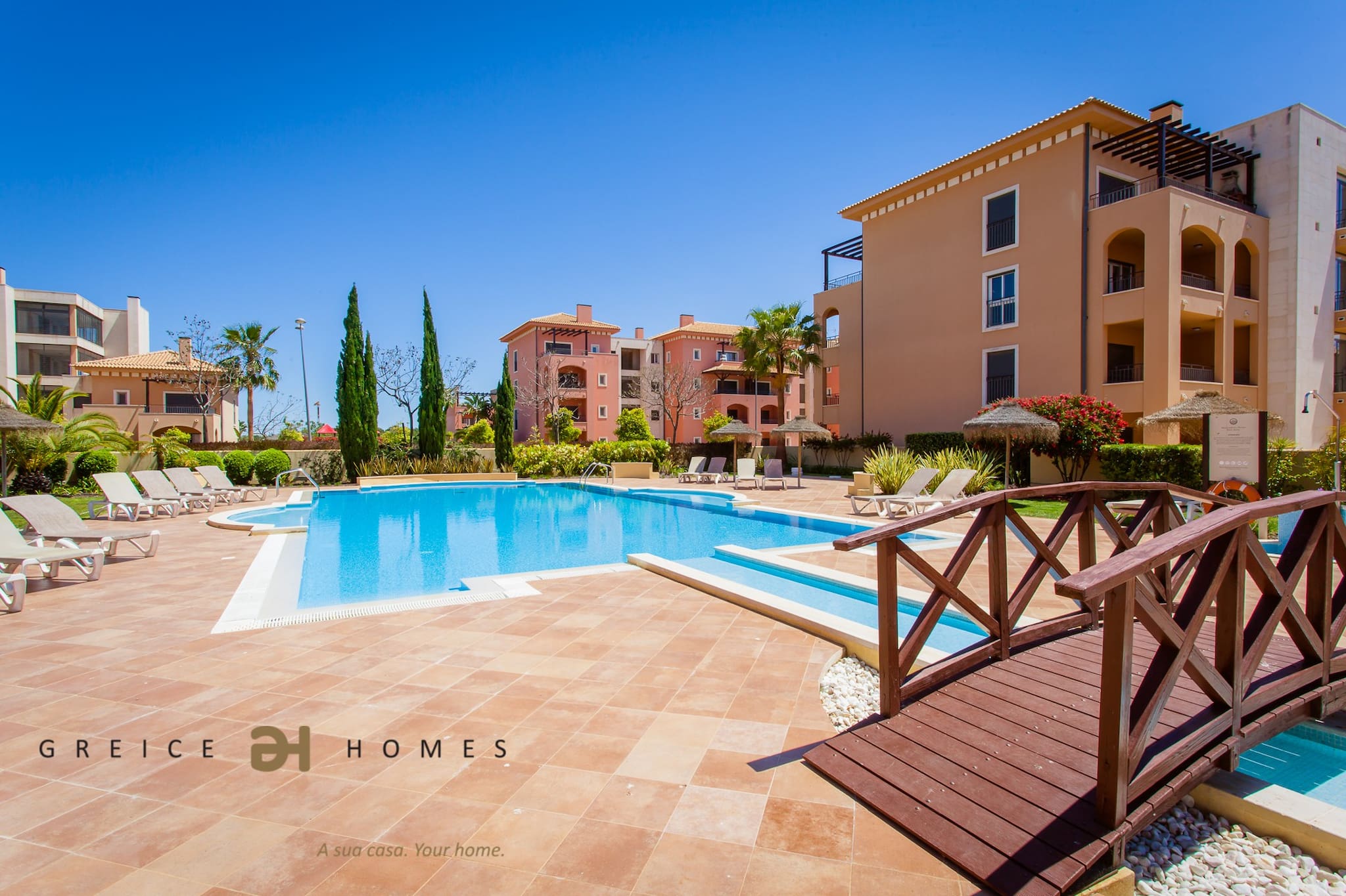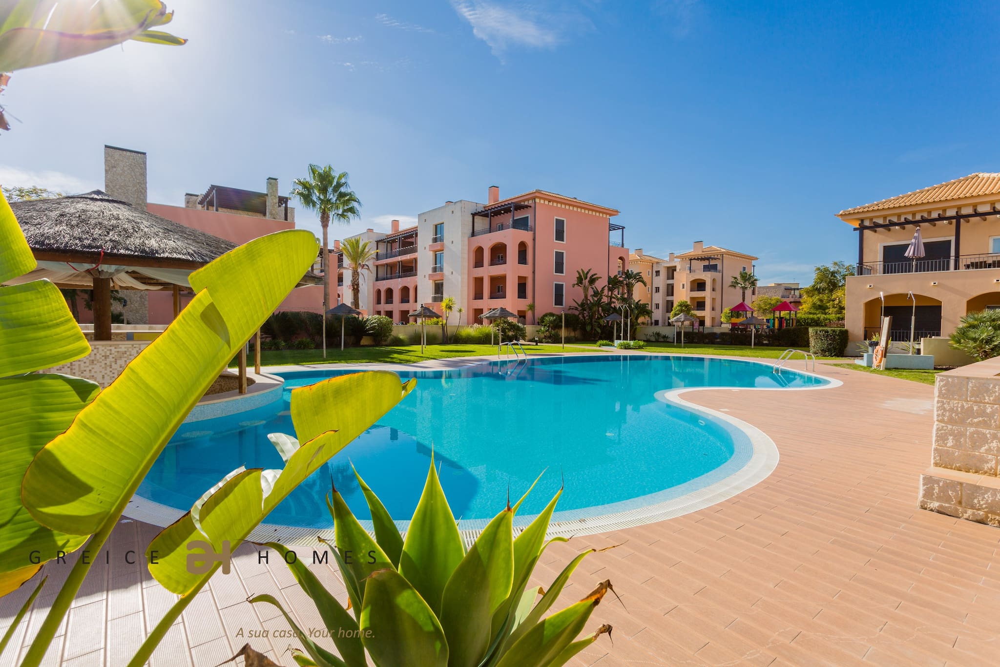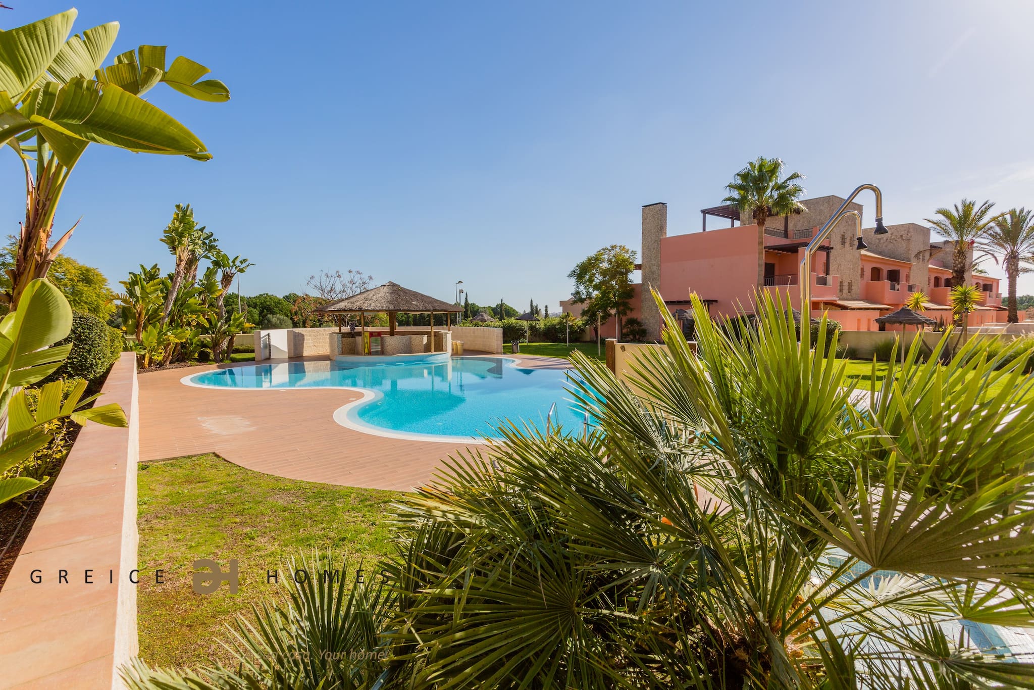 Le jardin avec pelouse et la grande piscine font de ce développement un lieu de détente pour vos vacances.