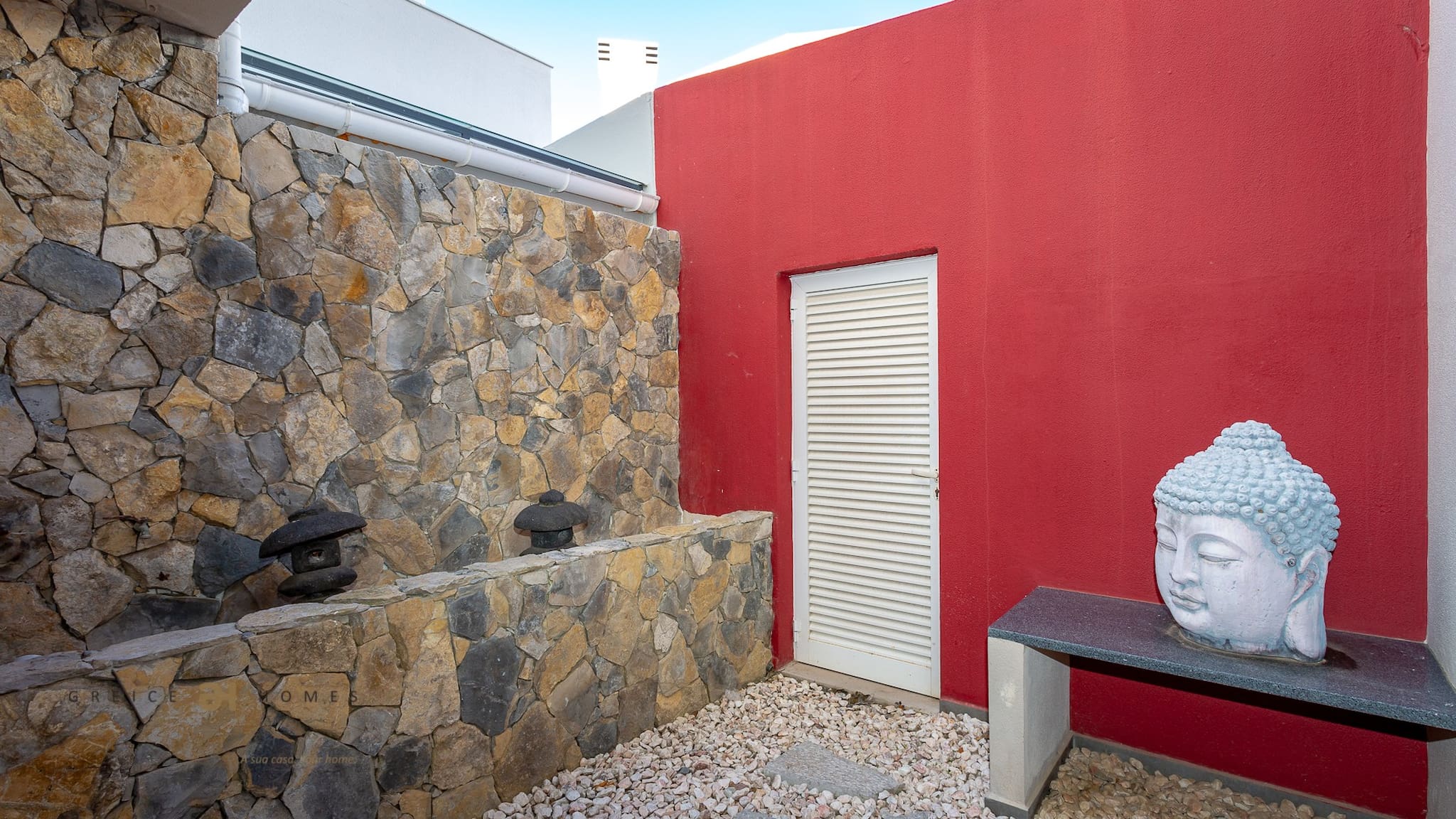 Toutes les pièces donnent accès à un beau jardin, avec un coin repas, barbecue, chaises longues et piscine. Dans le jardin également, on peut voir une décoration de style "Oriental".
